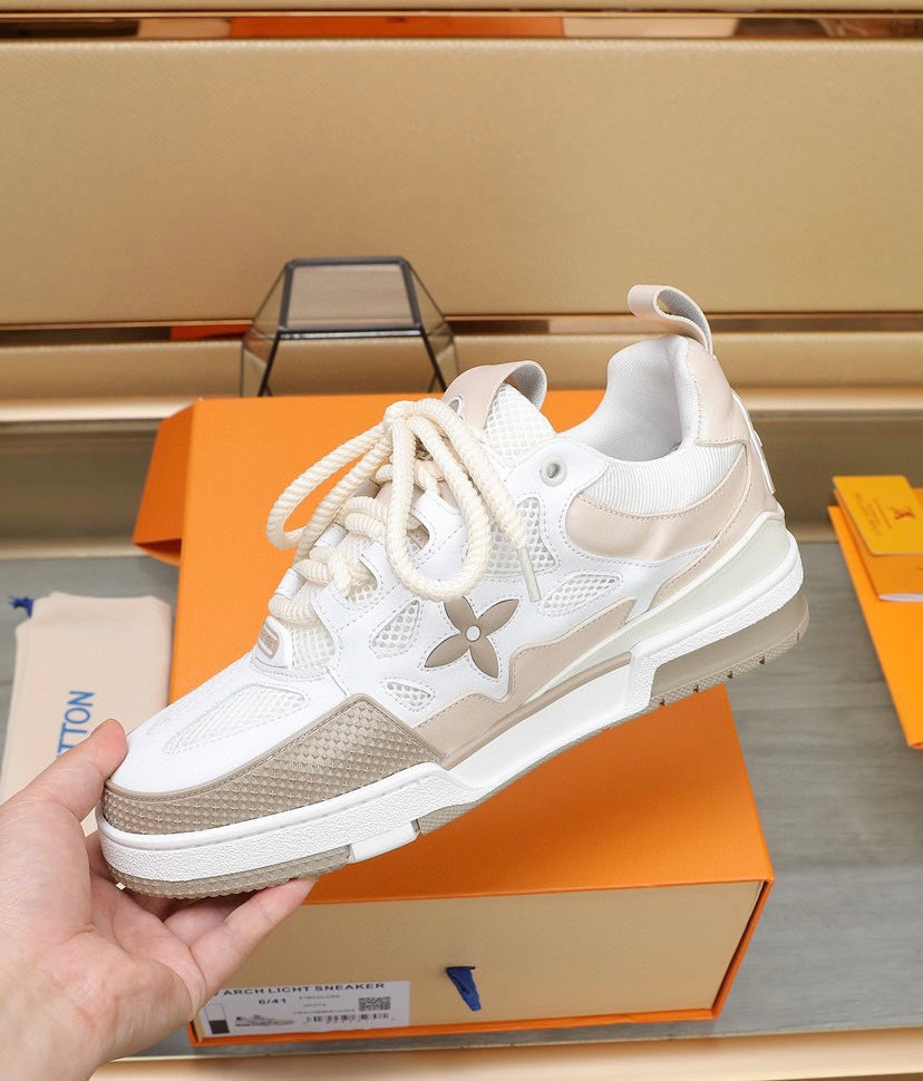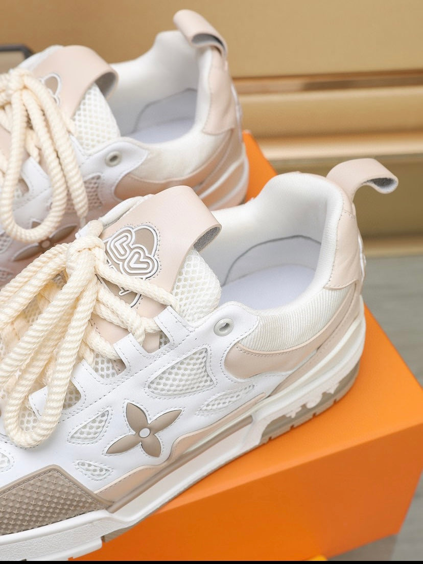 O tênis LV Skate faz referência a um design inspirado nos anos 90, visto pela primeira vez no desfile masculino Fall-Winter 2022 da Louis Vuitton. Seu elaborado cabedal bicolor com detalhes em Monogram Flower combina malha técnica, couro de bezerro e camurça. Este modelo se destaca pelo colarinho acolchoado, cadarços duplos técnicos e solado de borracha bicolor decorado com Monogram Flowers.