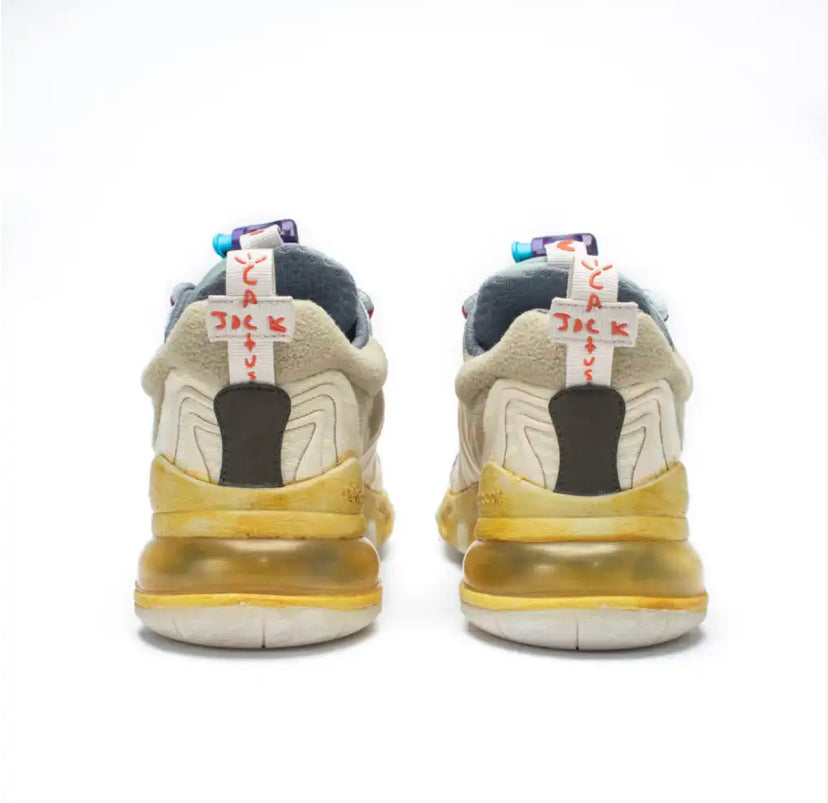 O Nike x Travis Scott Air Max 270 'Cactus Trails' mostra como Travis Scott escapa da realidade através de sua própria imaginação, em um mundo no qual ele e seus fãs se perdem. O design reúne uma atitude e estética dos anos 90 com uma sensação de desgaste. Os marrons e laranjas na camada de base pintada da espuma exposta são derivados de um estilo inspirado em trilhas de sobreposições com uma paleta de cores semelhante à afinidade de Travis Scott com o estilo vintage.